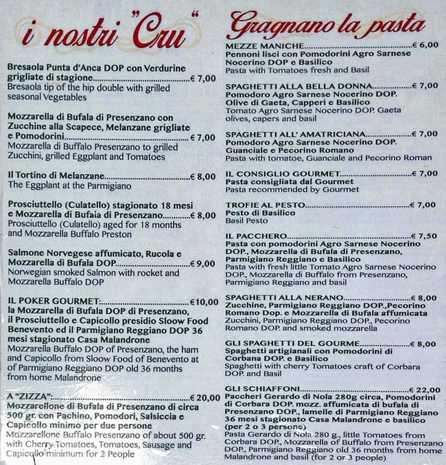 The menu of bottega vera in orvieto: