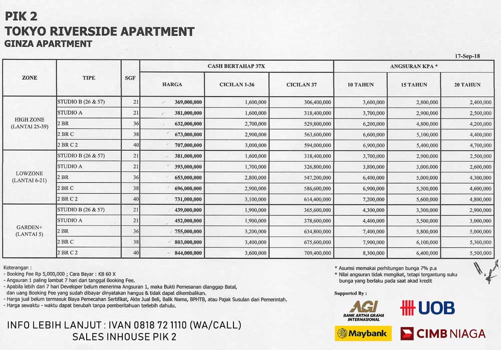 Berikut adalah price list harga apartemen tokyo riverside yang dijual saat ini.
